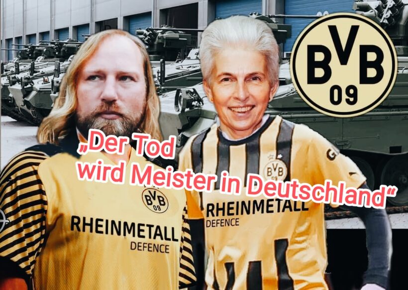 „Bin ab sofort kein BVB Fan mehr. Immerhin, dieses Traumpaar (siehe unser Titelfoto) zeigt ganz offen, von wem sie geschmiert sind. Und Rheinmetall soll gut zahlen.“