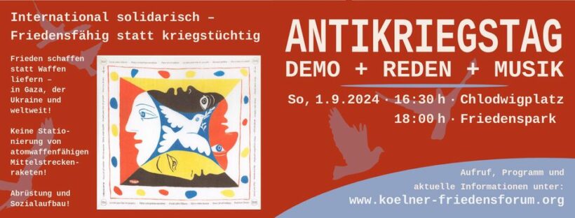 Unter dem Motto „International solidarisch – friedensfähig statt kriegstüchtig!“ ruft das Kölner Friedensforum am Antikriegstag, Sonntag, den 1. September 2024 um 16:30 Uhr, zu einer Kundgebung in Köln auf. Nach dem Auftakt am Chlodwigplatz ist eine Demo zum Friedenspark geplant, wo die Veranstaltung um 18 Uhr mit Musik der TNT Brassband Cologne ausklingen soll.