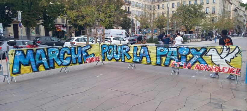 In Marseille wurde der Tag auf der Place Jean-Jaurès im lebendigen, multikulturellen Viertel La Plaine begangen, wo die Aktionsgruppe die Botschaft im Vorfeld durch Plakate, Radiointerviews und persönliche Gespräche verbreitet hatte. Der Tag markierte zugleich den 20. Jahrestag der ersten Begehung des Internationalen Tags der Gewaltfreiheit, der damals von der örtlichen humanistischen Gruppe ins Leben gerufen wurde. Seitdem hat diese Gruppe das wichtige Datum jedes Jahr kontinuierlich begangen. Aus Anlass des Starts des Weltmarsches fand die diesjährige Veranstaltung auf diesem öffentlichen Platz statt, unterstützt von der Stadtverwaltung, die für Logistik und Sicherheit sorgte.