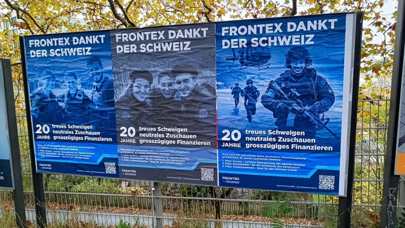 Wer heute Morgen in Trams und Bussen zur Arbeit fuhr oder an grossen Werbetafeln vorbeikam und die üblichen Werbeplakate betrachtete, hat sich wohl irritiert die müden Augen gerieben. Anstatt Werbung für eine neue Zahnbürste hing da etwas anderes. Die europäische Grenzagentur bedankte sich mit einem Geburtstagskarten-Wettbewerb und action-geladenen Bildern für die Unterstützung der Schweiz in den letzten zwei Jahrzehnten. Hinter der Aktion steckt ein Aktionskollektiv von Menschen die sich unter dem Motto „Frontex – 20 Jahre zu viel“ zusammengefunden haben.