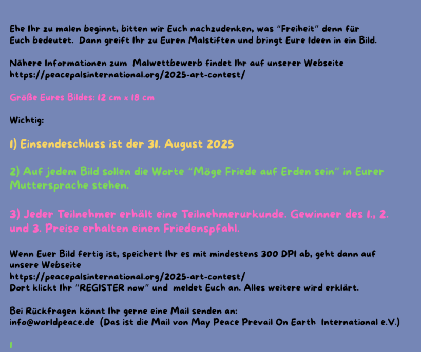 Zum 28. Mal lädt die Organisation May Peace Prevail On Earth International junge Menschen weltweit zur Teilnahme am Peace Pals International Art Contest ein. Kinder und Jugendliche im Alter von 5 bis 16 Jahren sind aufgerufen, ihre Gedanken und Visionen zum Thema „Freiheit“ künstlerisch auszudrücken. Einsendeschluss ist der 31. August 2025.