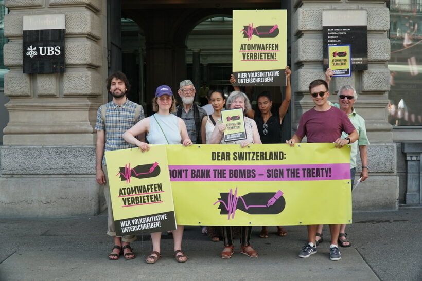 Vor genau einem Jahr wurde die Volksinitiative für ein Atomwaffenverbot lanciert – mit dem Ziel, dass die Schweiz endlich dem UNO-Atomwaffenverbotsvertrag (TPNW) beitritt. Während 70 Finanzinstitute weltweit seit Vetragsschluss ihre Beziehungen zu Atomwaffenproduzenten beendet haben, investiert die Schweizer Grossbank UBS weiter Milliardenbeträge in Unternehmen, die nukleare Massenvernichtungswaffen produzieren.