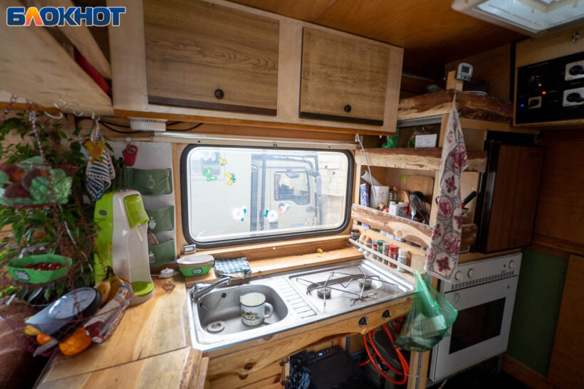 Das spätere Wohnmobil mit 600-Liter-Tank wurde als entmilitarisierter Magirus-Deutz 110 AW gekauft. Das gesamte Innenleben, vier Räume auf 12 Quadratmetern, hat Dieter selbst zusammengebaut, mit gebrauchten Bauteilen, Geräten und Möbeln. Am Eingang befindet sich ein Schuhregal mit ein paar Paar Hausschuhen. Auf der rechten Seite befindet sich eine voll ausgestattete und recht geräumige Küche mit einem Gasherd und einem Kühlschrank. Eigentlich gibt es hier nicht mehr als 3 Quadratmeter Platz, die Tatsache, dass es nicht viel Platz gibt, ist überhaupt nicht zu spüren.
