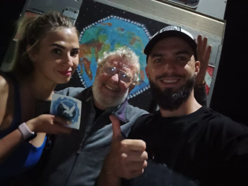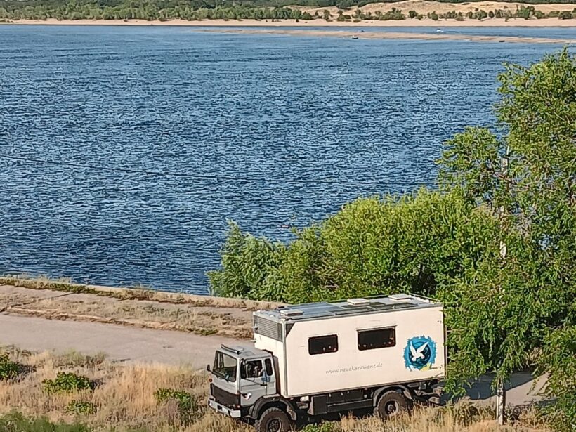 Dieter ist ein älterer, sehr emotionaler und herzlicher Mann. Er kam uns entgegen und trug ein T-Shirt mit dem Logo des Neue Karawane-Projekts, auf dem das Wort Freundschaft in mehreren Sprachen geschrieben stand. Das Logo für das Projekt mit der Taube wurde von der Tochter des Deutschen kreiert. Als Erstes klettern wir über eine hohe Metallleiter in das Wohnmobil.