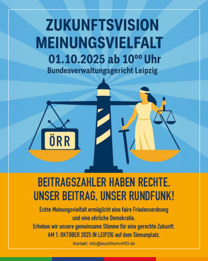 Wesentliche Grundvoraussetzung für eine funktionierende staatliche Gewaltenteilung ist ein ÖRR, der seinen in den Medienstaatsverträgen festgelegten Verpflichtungen tatsächlich gerecht wird. Eben diese werden Gegenstand im Revisionsverfahren gegen die einseitige Berichterstattung des ÖRR in vielen gesellschaftspolitischen Bereichen sein, das vor dem Bundesverwaltungsgericht in Leipzig am 1. Oktober 2025 stattfinden wird. Die Bürgerinitiative Leuchtturm ARD ORF SRG ruft alle wachen Demokraten auf: Kommet zuhauf!
