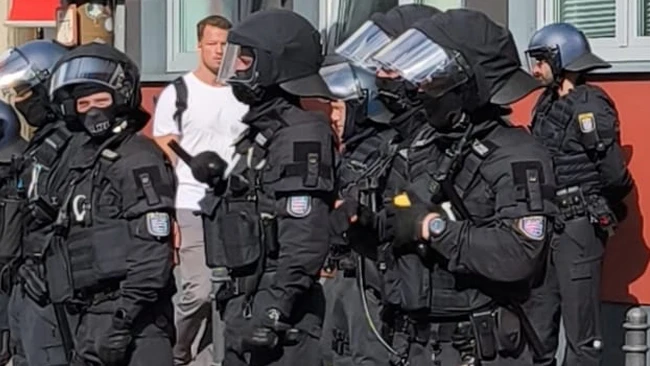 Den Demonstranten gegenüber stehen von Beginn an 1.600 Polizeikräfte (Angabe der Polizei). An den Strassen jede Menge Polizeifahrzeuge; desgleichen in den benachbarten Strassen. Wasserwerfer, Räumpanzer. Die Polizisten sind schwer bewaffnet und ausgerüstet. Knüppel, Handschellen, Pistole, dicke Handschuhe, feste Stiefel, schwere Helme mit Visier. Videoüberwachung, Drohnen. Alles ist gut sichtbar und vermittelt einen martialischen Eindruck. Zusätzlich verfügen die Einsatzkräfte über Pfefferspray (was man nicht sieht) und über Taser. Ihr ganzer Auftritt demonstriert: Sie können Menschen ausser Gefecht setzen und dabei schwer verletzen. So sieht eine Demonstration (es sei denn, sie ist von der Regierung explizit erwünscht) im Jahr 2025 im freiheitlichen Deutschland aus, noch bevor ein Schritt getan oder eine Parole gerufen wurde.