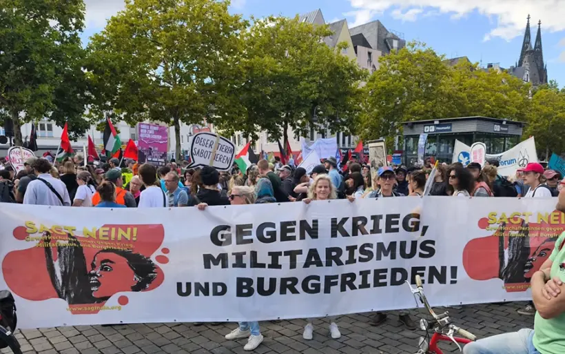 Bei der Demonstration am 30.8.2025 ging es um den Protest gegen die beschlossene Aufrüstung und Herstellung von Kriegstüchtigkeit in Deutschland – im Anschluss an ein Camp, bei dem über diese Themen einige Tage lang diskutiert worden war und zwei Tage vor dem nationalen Anti-Kriegstag.