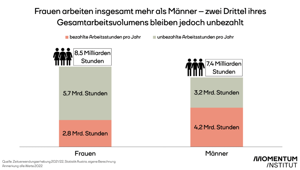 Dass rechtliche Gleichberechtigung auch faktische Gleichberechtigung bedeutet, ist ein schöner Gedanke. Die Realität sieht nur leider anders aus. Dazu reicht ein aktueller Blick auf die Gründe, die bereits für den isländischen Frauenstreik von 1975 ausschlaggebend waren: Im österreichischen Parlament sitzen im Jahr 2025 vor allem Männer. Der Frauenanteil liegt dort bei 35,5 Prozent, in der Gesamtbevölkerung hingegen bei 51 Prozent. Frauen haben um insgesamt 34 Prozent weniger Einkommen als Männer. Sie arbeiten aber mehr Stunden – nur weniger davon bezahlt. Denn sie leisten zwei Drittel der unbezahlten Arbeit: etwa bei Hausarbeit, Erziehung, Betreuung oder Pflege. Auch wenn ihnen diese Arbeit nicht bezahlt wird, profitieren andere in Staat, Gesellschaft und Wirtschaft auch finanziell davon.