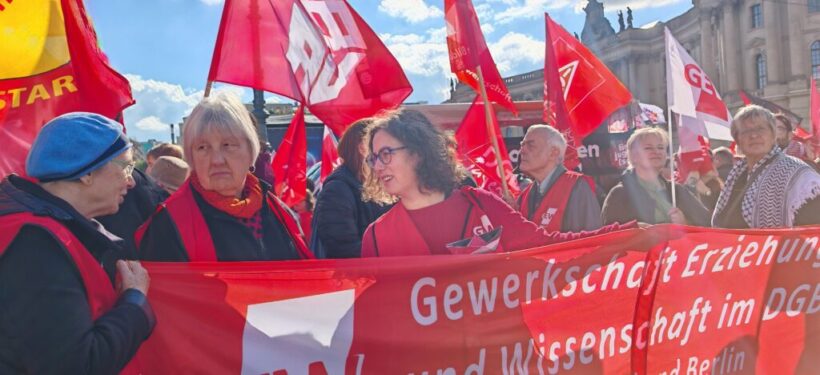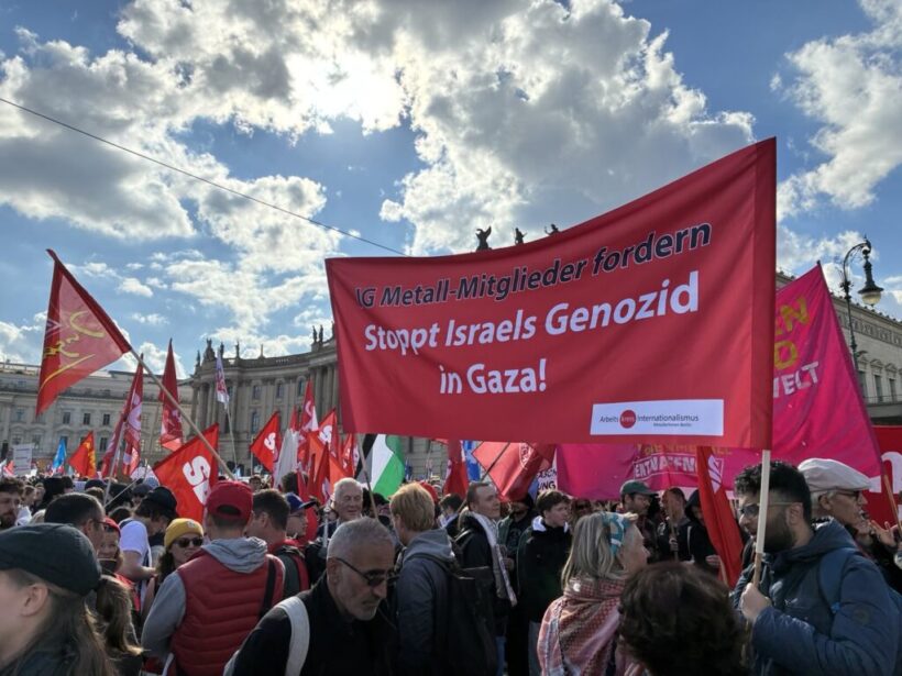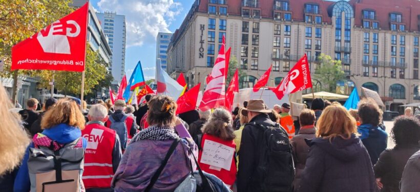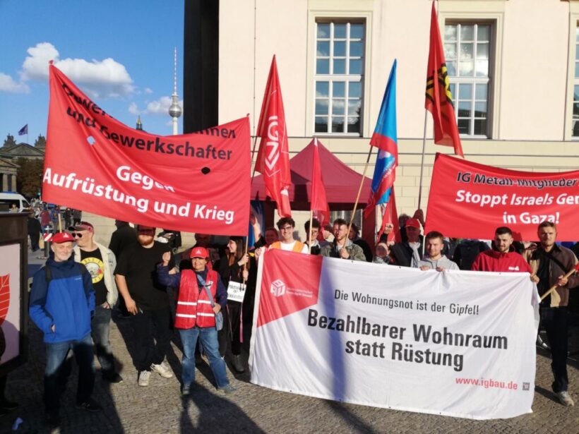 Am 3. Oktober auf der zentralen Friedensdemonstration in Berlin haben sich erneut hunderte von Gewerkschafter:innen – GEW, IG BAU , ver.di, IG Metall – von Berlin und Hamburg gegen den aktuellen deutschen Kriegs- und Großmachtkurs zusammengeschlossen. Neben den Forderungen gegen die Militarisierung der ganzen deutschen Gesellschaft brachten sie auch wieder ihre Solidarität mit den Menschen in Gaza zum Ausdruck.