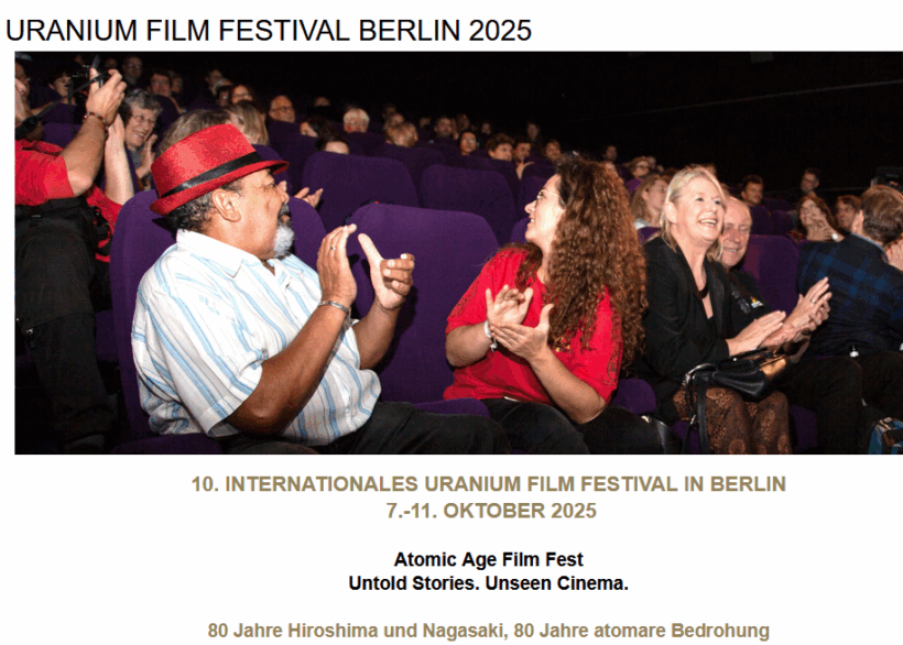 Vom 7. bis 11. Oktober 2025 zeigte das Uranium Film Festival an mehreren Spielorten zum 10. Mal in Berlin – Zeiss-Großplanetarium, Lichtblick Kino, Filmkunst 66, Moviemento Kino, Kino & Bar in der Königstadt, ACUD Kino – rund 20 Filme zu Hiroshima, Nagasaki, Atomtests, Uranwaffen, Uranbergbau und Atomkraft.