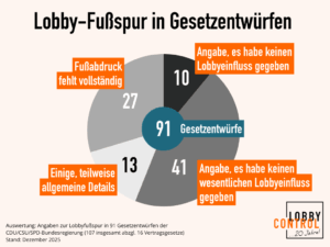 91 Gesetzentwürfe hat die schwarz-rote Bundesregierung seit Beginn der Wahlperiode dem Bundestag vorgelegt. Doch nur 13 davon enthalten überhaupt Angaben zum Interesseneinfluss auf den Entwurf – und das zum Teil auch nur sehr allgemein. Bei 27 Gesetzentwürfen fehlt die Kategorie „exekutiver Fußabdruck“ schon von vornherein ganz. Bei fast der Hälfte der Entwürfe ist lediglich vermerkt, Interessenvertreter*innen hätten keinen „wesentlichen“ Einfluss auf den Entwurf gehabt. Das ist nicht zielführend.