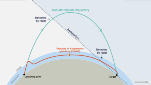 Vergleich der Flugbahn einer Hyperschallwaffe (orange dargestellt) mit der einer ballistischen Rakete (ICBM) (türkis dargestellt). Wie beim historischen Fractional Orbital Bombardment System (FOBS) fliegt der Flugkörper in einem flachen Winkel zum Ziel und kann von Warn- und Abwehrsystemen nur schwer und spät erkannt werden. Es ist unklar, ob derartige Waffen überhaupt abgewehrt werden können. (de.wikipedia.org)