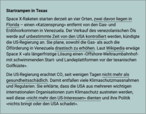 Denn der Flugverkehr verbrauche zwar viel mehr Treibstoff – aber nur bis in eine Höhe von 15 Kilometern. Dort dauere das «Herauswaschen» der Verschmutzung bloß Wochen. In der höher gelegenen, «empfindlichen mittleren Atmosphäre» dagegen vergehe wegen der langsamen Zirkulation ein halbes Jahrzehnt, bis die Verschmutzung wieder «herausgewaschen» sei. Das Fazit der beiden Wissenschaftler: «Einzig die Raumfahrtindustrie verschmutzt die mittlere Stratosphäre und die Mesosphäre […] und über die Auswirkungen auf das Klima und das Ozon ist nicht viel bekannt.»