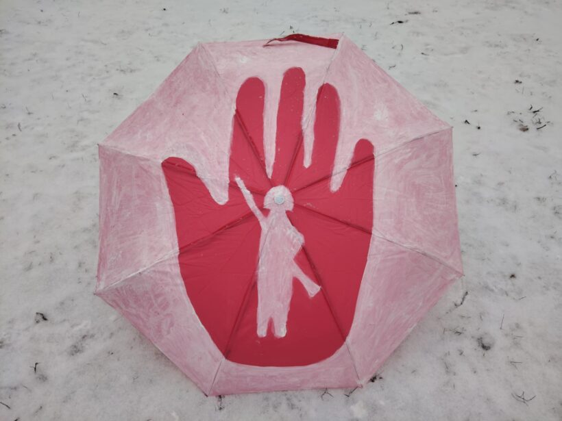Wie ein mahnendes Stoppschild lenkt das Zeichen der roten Hand die Aufmerksamkeit auf eine der gravierendsten Menschenrechtsverletzungen: