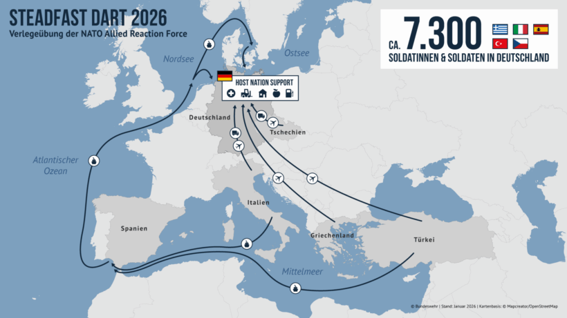 (Eigener Bericht) – Die europäischen NATO-Staaten trainieren mit dem Manöver Steadfast Dart im zweiten Jahr in Folge das Zusammenziehen ihrer Streitkräfte in Deutschland zum Weitermarsch nach Osten – und zwar ohne die USA. Das dem Manöver zugrundeliegende Szenario sei nicht mehr fiktiv, betont die Bundeswehr. Geleitet wird die NATO-Operation vom Allied Joint Force Command der NATO im niederländischen Brunssum, das von einem deutschen General geführt wird. Die Bundesrepublik präsentiert sich dabei als militär-logistische Drehscheibe der NATO in Europa und setzt damit eine Politik fort, die sie bereits mehrere Jahre vor der sogenannten Zeitenwende begonnen hat. Der Tatsache, dass die USA an dem Manöver nicht teilnehmen, liegen Verschiebungsprozesse im transatlantischen Verhältnis zugrunde, die tiefer reichen als die aktuellen Konflikte um Grönland und den Iran-Krieg. Berlin sucht seit Jahren das Kräfteverhältnis innerhalb der NATO zu seinen Gunsten zu verändern. Der Versuch, den europäischen Pfeiler der NATO zu stärken, ist ein wesentlicher Bestandteil des deutschen Strebens nach größerer militärischer Unabhängigkeit von den USA. Dabei erhebt Berlin im militärisch unabhängiger werdenden Europa einen Führungsanspruch.