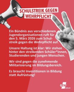 „Für den Donnerstag hat die bundesweite Initiative „Schulstreik gegen Wehrpflicht“ zu einem weiteren Schulstreik aufgerufen. Schon am 5. Dezember hatten bundesweit über 55.000 Schüler:innen an einem ersten Streik teilgenommen. Am selben Tag war das erneuerte Wehrdienstgesetz vom Bundestag beschlossen worden. Seit Januar werden daher an alle Jugendlichen zum 18. Geburtstag Musterungsbriefe versendet.