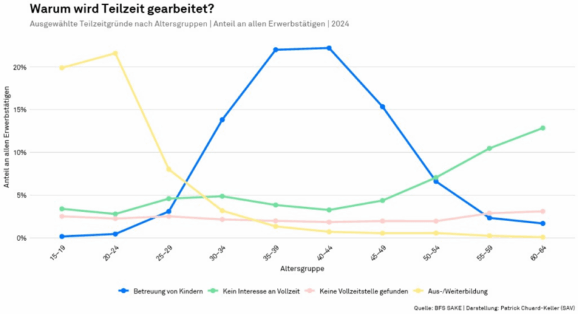 «Interessant wird es danach», schreibt der Arbeitgeberverband, «ab etwa 50 Jahren steigt der Anteil jener, die angeben, kein Interesse an einer Vollzeitstelle zu haben, und deswegen Teilzeit arbeiten. Sie könnten mehr arbeiten, wollen aber nicht.» Der Arbeitgeberverband stützt sich dabei auf Zahlen aus der Schweizerischen Arbeitskräfteerhebung.