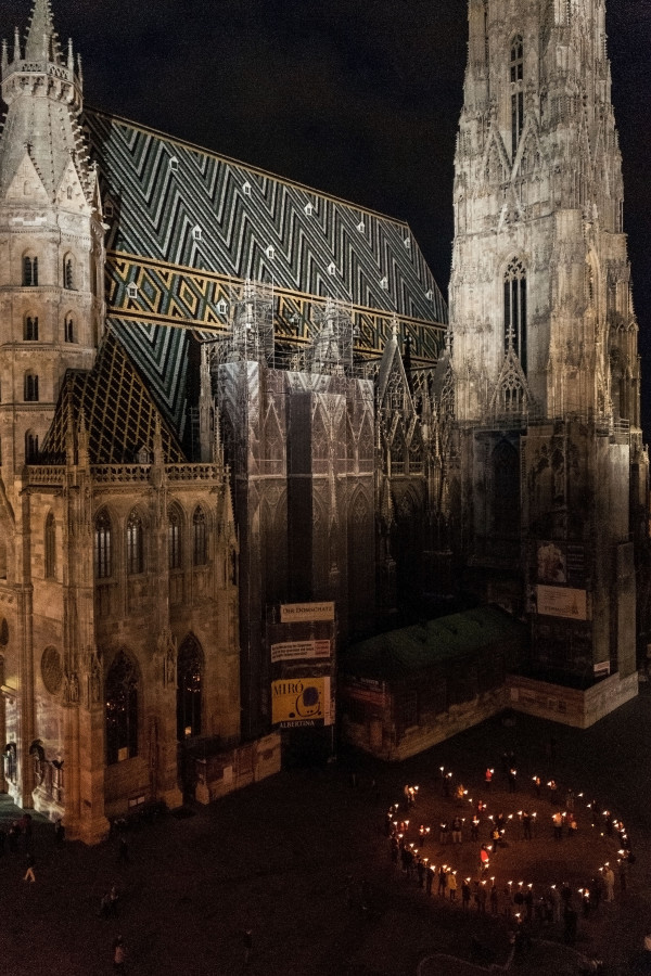 Im Rahmen der Kampagne von „gewaltfreiraum.net“ formten in Wien ca. 150 Menschen am Stephansdom ein Peacezeichen mit Fackeln.