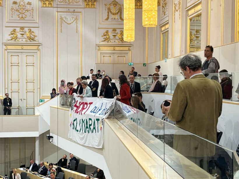 Wir machen unsere Regierung darauf aufmerksam, dass wir nicht kampflos hinnehmen, dass sie Klimaschutz bis jetzt nicht ernst nimmt. Noch können wir die Katastrophe durch sofortige Maßnahmen abmildern: „Hört auf den Klimarat!“ steht auf dem Banner, das von der Galerie des Plenarsaales heruntergelassen wurde.