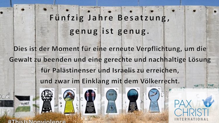 Diesen Monat jährt sich die israelische Besatzung der palästinensischen Gebiete zum 50. Mal. Aus diesem Anlass ruft Pax Christi International gemeinsam mit seinen Mitgliedsorganisationen die internationale Gemeinschaft auf, für die sofortige Beendigung der 50jährigen israelischen Besatzung einzutreten und die Wiederaufnahme…