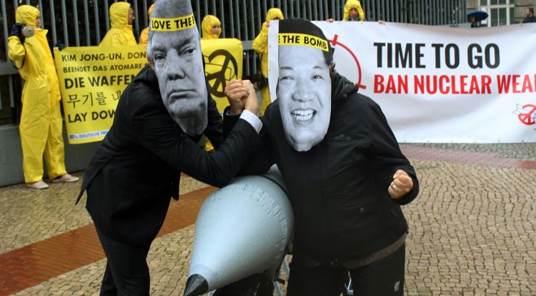 Mit einer nachgebauten Atombombe in Originalgröße haben Friedensaktivisten gegen einen drohenden Atomkrieg zwischen Nordkorea und den USA protestiert. Am Mittwochmorgen versammelten sie sich vor den Botschaften der beiden Länder in Berlin und forderten von allen beteiligten Staaten eine Deeskalation. Felix…
