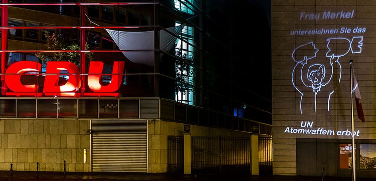 Lichtprojektion neben der CDU-Zentrale „Unterzeichnen Sie das Atomwaffenverbot!“