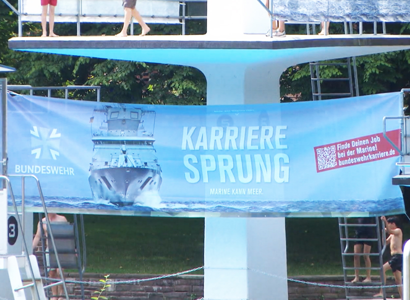 Die Kölner Gruppe der Deutschen Friedensgesellschaft – Vereinigte KriegsdienstgegnerInnen (DFG-VK) protestiert am 14.8.2024 mit einer Kundgebung gegen die Bundeswehr-Werbung am Sprungturm des Kölner Stadionbades. „Das Banner mit der Aufschrift ‚Karrieresprung’ soll unsere Kinder wohl für die ‚Ostfront‘ gegen Russland mobil…