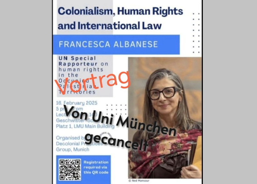 Von Peter Vlatten Die Universität München hat den Vortrag von Francesca Albanese, der UN-Berichterstatterin für Palästina, abgesagt. Francesca Albanese selbst gibt zu diesem unglaublichen Vorgang eine souveräne Erklärung ab: „Die Universität München hat meinen Vortrag abgesagt, eine Entscheidung, die die…
