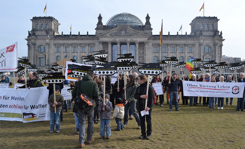 95.000 Unterschriften an Bundestagsvizepräsidentin Edelgard Buhlmann übergeben. Protest mit Panzer, Chorgesang und Transparenten vor dem Reichstag. Pressemitteilung der Aktion Aufschrei zum heutigen Aktionstag „Grenzen öffnen für Menschen. Grenzen schließen für Waffen.“: Mit Panzerattrappen, Chorgesang und Transparenten demonstrierten Repräsentantinnen und Vertreter der…