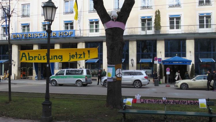 München, 5.2.2017: Im Vorfeld der in zwei Wochen stattfindenden Münchner Sicherheitskonferenz schmückten am heutigen Sonntag AktivistInnen vom Pazifistischen Aktionsbündnis München die Grünanlage am Promenadeplatz vor dem Hotel Bayerischer Hof. Große und kleine Friedenstauben schmücken jetzt einen Baum sowie eine Parkbank…