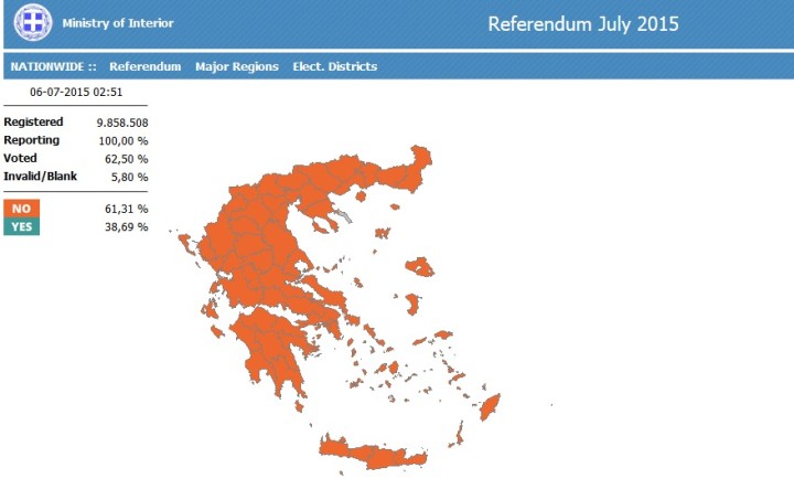 Πάντα θεωρούσα το πορτοκαλί χρώμα της ελπίδας. Σήμερα, αντικρίζοντας την πρωτοφανή εικόνα στην τηλεόραση μιας φίλης, έμεινα εμβρόνητη μη ξέροντας πώς να αντιδράσω. Για πρώτη φορά σε αποτέλεσμα κάλπης όλη η Ελλάδα είχε ένα χρώμα, όλη η Ελλάδα ντύθηκε πορτοκαλί. Το ΟΧΙ στο τελεσίγραφο των Θεσμών της 25ης Ιουνίου είναι αδιαμφισβήτητο, ανεξάρτητα με το ποσοστό ανά νομό. Φαίνεται να ξεπερνά το 61% των ψηφοφόρων, να υπερισχύει με 20% του ΝΑΙ και όλο αυτό σε ένα ποσοστό 60% του εκλογικού σώματος που προσήλθε να ψηφίσει (θυμίζω ότι για την εγκυρότητα του δημοψηφίσματος έπρεπε να προσέλθει τουλάχιστον το 40% του εκλογικού σώματος). Ας μην αναφέρουμε ότι το θέμα αφορούσε οικονομία.