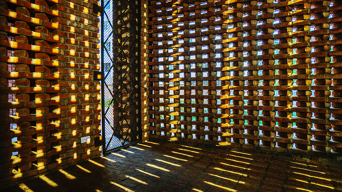Late afternoon sun showing the long shadows formed by the Jali brick formation, where light and ventilation are naturally provided – Bait Ur Rouf Mosque, Dhaka, Bangladesh.