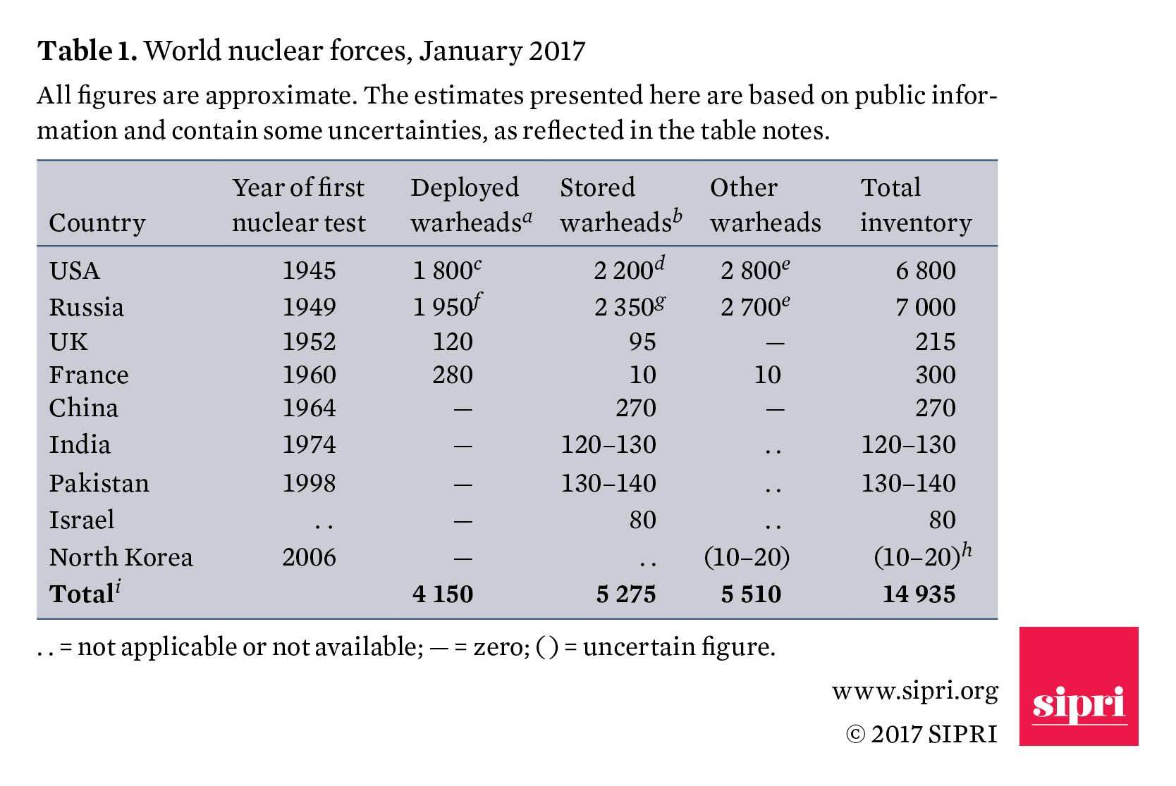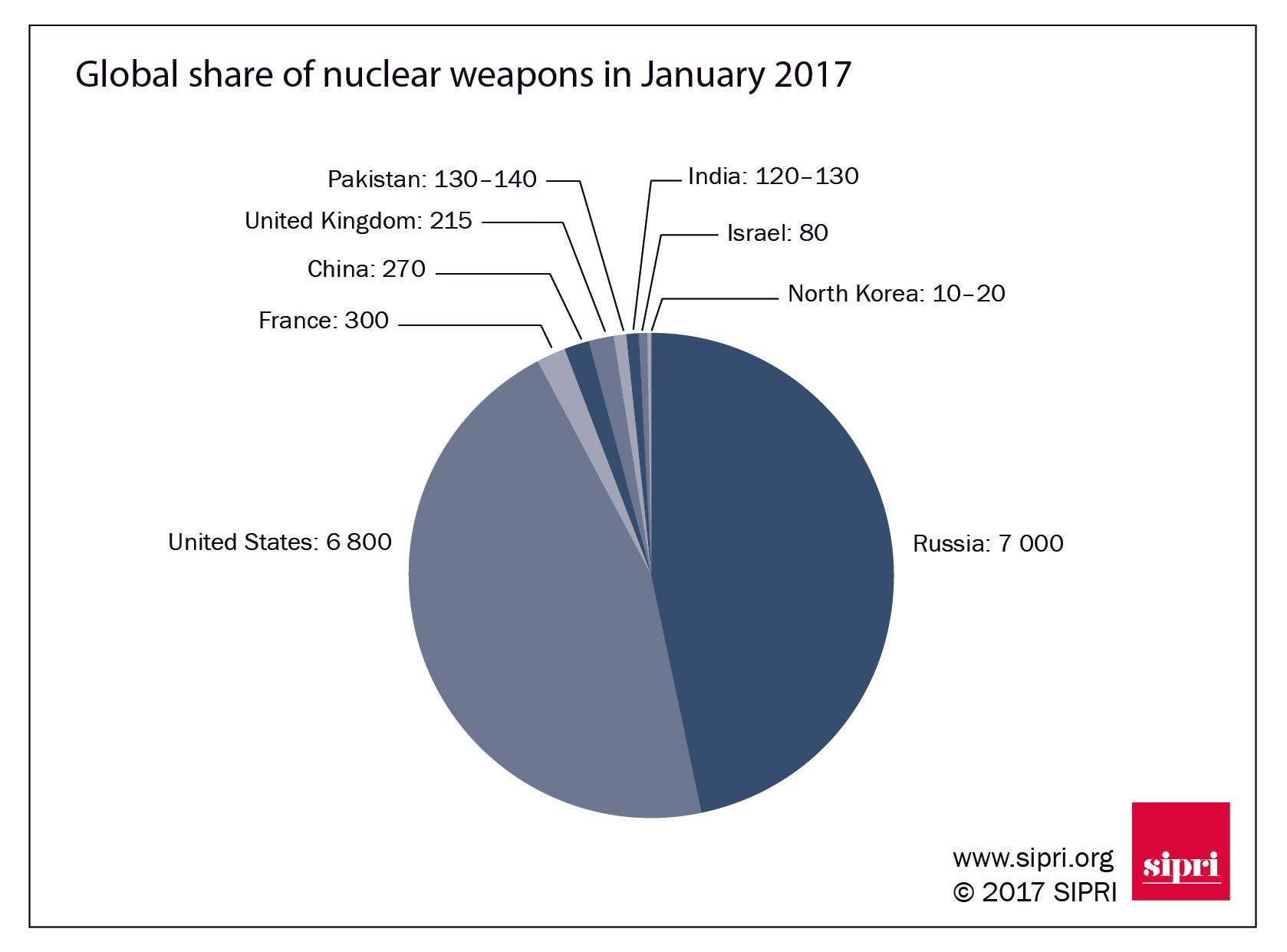 Στις αρχές του 2017, εννέα χώρες – οι Ηνωμένες Πολιτείες, η Ρωσία, το Ηνωμένο Βασίλειο, η Γαλλία, η Κίνα, η Ινδία, το Πακιστάν, το Ισραήλ και η Βόρεια Κορέα – διέθεταν περίπου 4.150 πυρηνικά όπλα τοποθετημένα σε βάσεις ή πυραύλους με επιχειρησιακές δυνάμεις. Αν μετρήσουμε όλες τις πυρηνικές κεφαλές, αυτές οι χώρες συγκεντρώνουν συνολικά περίπου 14.935 πυρηνικά όπλα, έναντι 15.395 στις αρχές του 2016.