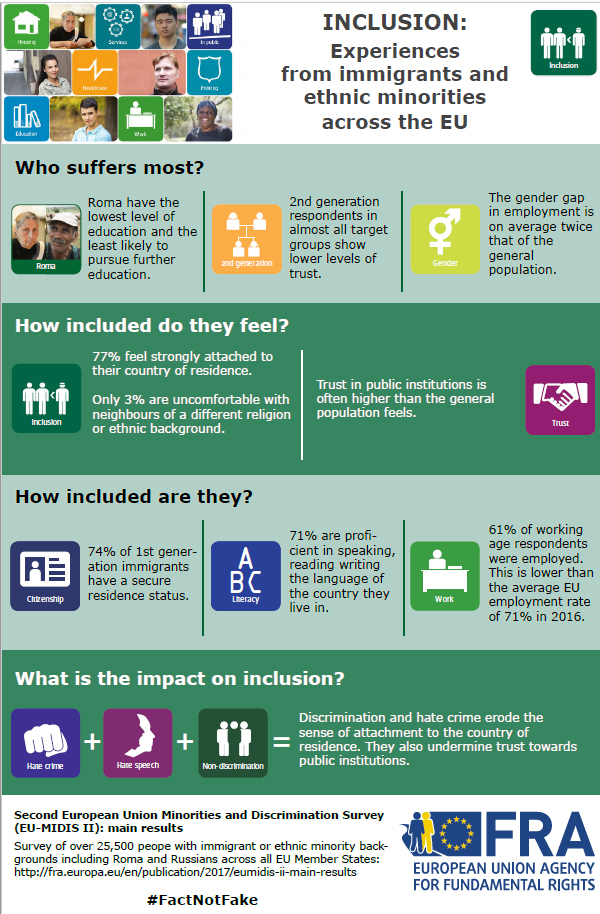Οι εκτεταμένες διακρίσεις, η μισαλλοδοξία και το μίσος που εξακολουθούν να εκδηλώνονται στο σύνολο της ΕΕ απειλούν να περιθωριοποιήσουν και να αποξενώσουν πολλά μέλη μειονοτικών ομάδων που κατά τα άλλα αισθάνονται σε μεγάλο βαθμό συνδεδεμένοι με τη χώρα στην οποία ζουν και εμπιστεύονται τους θεσμούς της. Τα πορίσματα αυτά προκύπτουν από μεγάλη επαναλαμβανόμενη έρευνα που πραγματοποίησε ο Οργανισμός Θεμελιωδών Δικαιωμάτων της Ευρωπαϊκής Ένωσης (FRA).