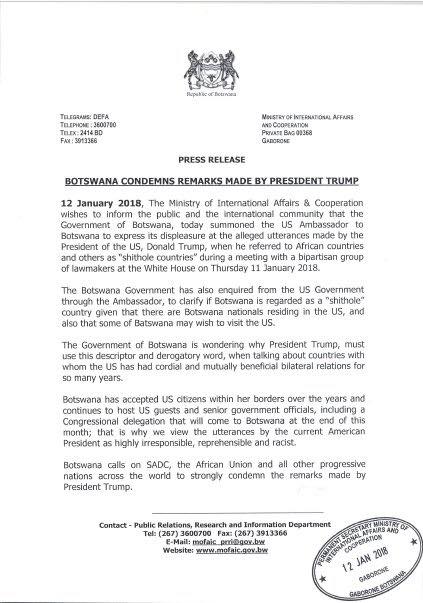 Διεθνής είναι η καταδίκη για αυτά τα απαξιωτικά σχόλια του Προέδρου. Ο Ύπατος Αρμοστής του ΟΗΕ για τα ανθρώπινα δικαιώματα, Rupert Colville, δήλωσε στο DemocracyNow! ότι «είναι σοκαριστικά σχόλια και φέρνουν ντροπή, λυπάμαι που δεν μπορώ να χρησιμοποιήσω άλλο επίθετο για να τα περιγράψω, είναι ρατσιστικά [..] το δε σχόλιο για τη Νορβηγία κάνει ακόμα πιο ξεκάθαρη τη συγκεκριμένη δήλωση και [..] έρχονται σε αντίθεση με τις παγκόσμιες αξίες που τόσο έχουμε προσπαθήσει να υιοθετήσουμε στον κόσμο μετά το πέρας του Β’ παγκοσμίου πολέμου». Αντίστοιχες καταγγελίες για τις εν λόγω δηλώσεις έγιναν από κυβερνητικά στελέχη της Νοτίου Αφρικής, της Μποτσουάνα καθώς και ακτιβιστές της Αϊτής, όπως ο Rene Civil αλλά και αμερικανο-αϊτινούς συγγραφείς όπως η Edwidge Danticat.