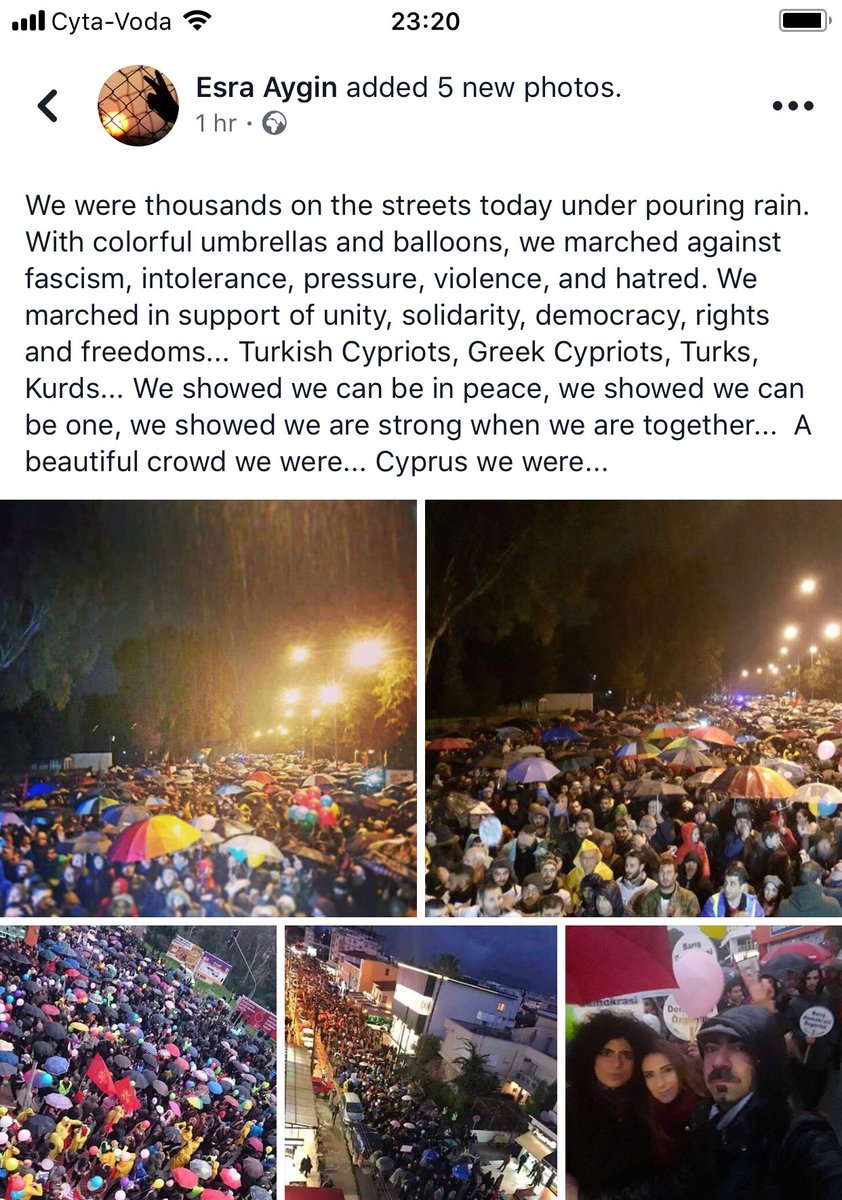 Τουλάχιστον 5000 άνθρωποι αψήφισαν τη βροχή και συγκεντρώθηκαν χτες σε ειρηνική διαμαρτυρία στη βόρεια Λευκωσία υπέρ της ειρήνης, της δημοκρατίας, της ελευθερίας έκφρασης και ενάντια στο φασισμό. Εκτός από Τουρκοκύπριους, βάδισαν μαζί ΕλληνοΚύπριοι, Τούρκοι και Κούρδοι, όπως μεταδίδει από το twitter της η Esra Aygin και το Unite Cyprus Now.
