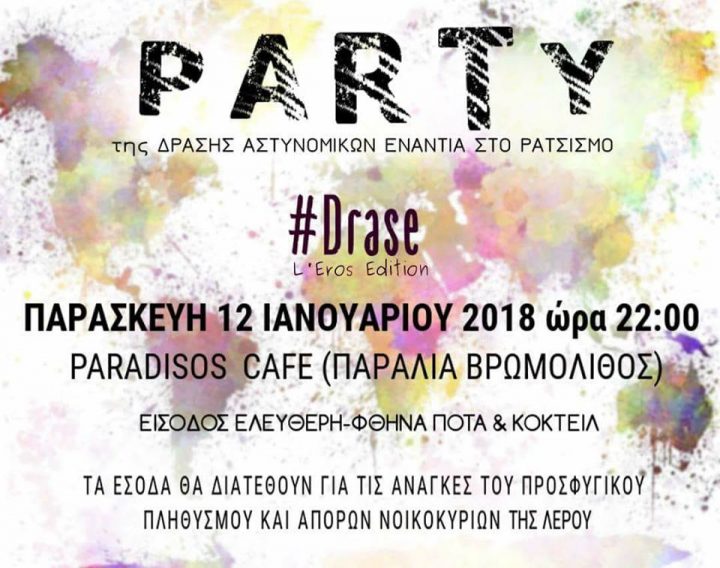 – Παρασκευή 12/1/2017 και από τις 22:00 έως το πρωί διοργάνωση πάρτυ στο καφε-μπαρ Παράδεισος στην παραλία του Βρωμόλιθου, όλα τα έσοδα της οποίας θα διατεθούν για την κάλυψη βασικών αναγκών του προσφυγικού πληθυσμού του ΚΥΤ Λέρου και άπορων νοικοκυριών του νησιού. Καλούμε σε μαζική συμμετοχή στην εκδήλωση τους συναδέλφους μας , τους εργαζόμενους σε δομές για τους πρόσφυγες, τους αλληλέγγυους και τους κατοίκους του νησιού, για να διασκεδάσουν μέχρι πρωίας για καλό σκοπό.