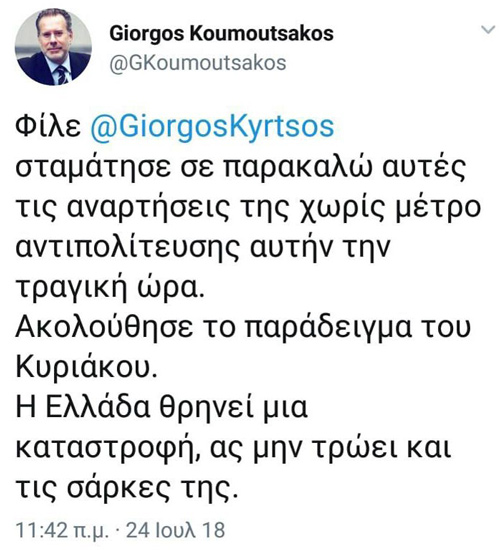 Υ.Γ Όπως έχουμε πει πολλές φορές δεν υπάρχουν φυσικές καταστροφές. Όταν ένα φυσικό φαινόμενο κάνει την εμφάνισή του σε κατοικημένες περιοχές αυτομάτως μετατρέπεται σε πολιτικό γεγονός και δεν αντιμετωπίζεται με ευχολόγια αλλά με πολιτικές πράξεις. Ο ΣΥΡΙΖΑ το γνώριζε στις πυρκαγιές του 2007 αλλά το ξέχασε στις πυρκαγιές του 2018
