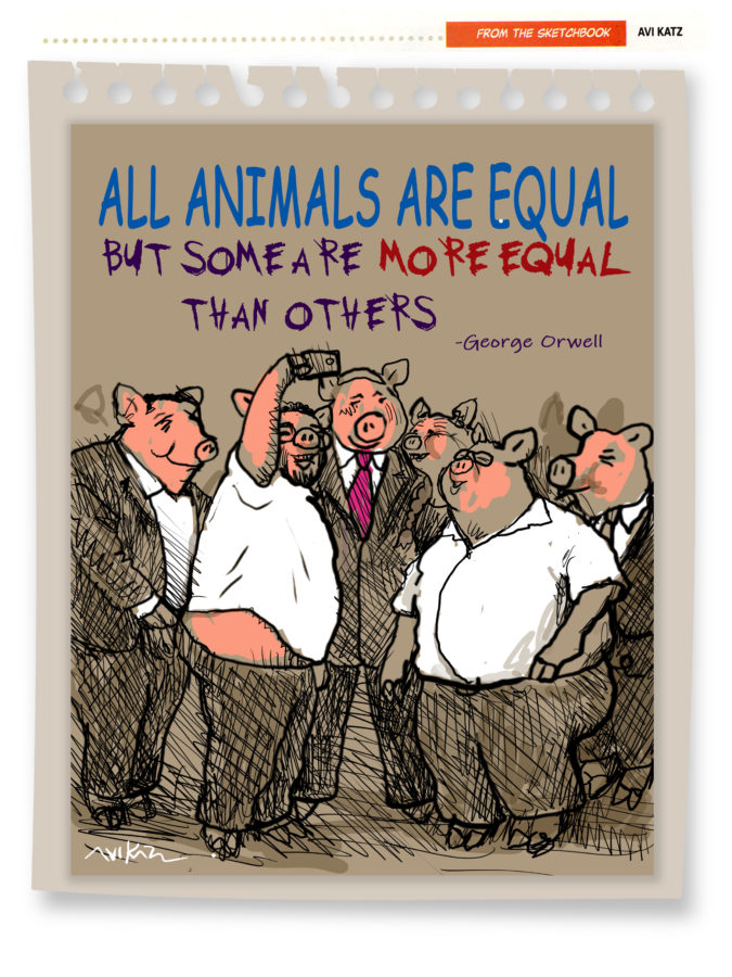 Ο ισραηλινός γελοιογράφος Avi Katz ενημερώθηκε από το περιοδικό The Jerusalem Report, με το οποίο συνεργαζόταν ως freelancer από το 1990, ότι δεν θα δημοσιεύει πλέον τα σκίτσα του, μετά τη δημοσίευση μιας γελοιογραφίας στη σελίδα του στο Facebook πριν τη δημοσιεύσει το περιοδικό. Τα μέλη της ισραηλινής κυβέρνησης απεικονίζονται ως χοίροι, κάτω από το μότο “Όλα τα ζώα είναι ίσα, αλλά μερικά είναι πιο ίσα από άλλα”, ένα διάσημο απόσπασμα από το σατιρικό μυθιστόρημα Animal Farm, του George Orwell.