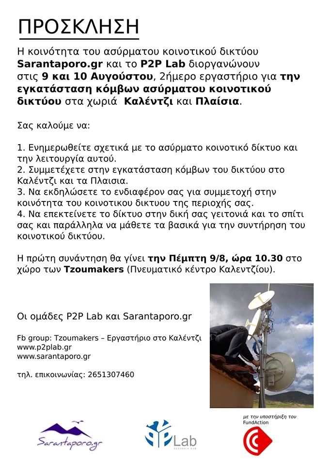 Tο Sarantaporo.gr και το P2P Lab διοργανώνουν ένα διήμερο εργαστήριο για την εγκατάσταση κόμβων ασύρματου κοινοτικού δικτύου, στα χωριά Καλέντζι και Πλαίσια, στα Ιωάννινα, στις 9 και 10 Αυγούστου και μας καλούν να συμμετέχουμε, να μάθουμε και ίσως να συνεχίσουμε αλλού τις εγκαταστάσεις…