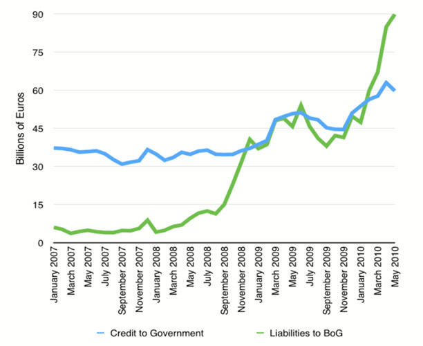 Στο παρακάτω γράφημα, μπορούμε να διαπιστώσουμε με σαφήνεια, ακολουθώντας την εξέλιξη της πράσινης γραμμής, ότι από τον Σεπτέμβριο του 2008, οι ελληνικές τράπεζες καταφεύγουν σε σημαντικά αυξημένο βαθμό στην χρηματοδότηση που τους παρέχει η Κεντρική Τράπεζα της Ελλάδας, στα πλαίσια του ευρωσυστήματος, με την σύμφωνη γνώμη της ΕΚΤ [10].