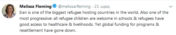 Ακολουθεί πίνακας με τους κυριότερους άξονες παρεμβάσεων του Ιράν στον προσφυγικό πληθυσμό, όπως τις δημοσίευσε στο τουίτ της η Fleming.