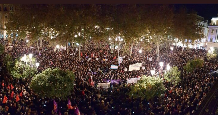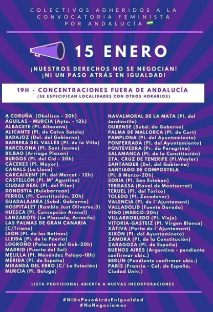 Οι κινητοποιήσεις που ξεκίνησαν το πρωί έξω από το Κοινοβούλιο της Ανδαλουσίας, πολλαπλασιάζονται σε όλη την Ισπανία. Δίκτυα που δημιουργήθηκαν επί των ημερών της Ευρωπαϊκής άνοιξης και συνεχίζουν άτυπα μέχρι και σήμερα, βγήκαν στους δρόμους σε όλη τη χώρα ενάντια σε φασιστικές πολιτικές που κυρίως επικεντρώνονται στην συρρίκνωση των δικαιωμάτων των γυναικών στην περιοχή της Ανδαλουσίας ως αποτέλεσμα των πρόσφατων εκλογών. Τα σλόγκαν/hashtag που χρησιμοποιούν λένε: “Ούτε μία λιγότερη”, “Τα δικαιώματά μας δεν είναι διαπραγματεύσιμα”, “Ούτε βήμα πίσω στην ισότητα”.