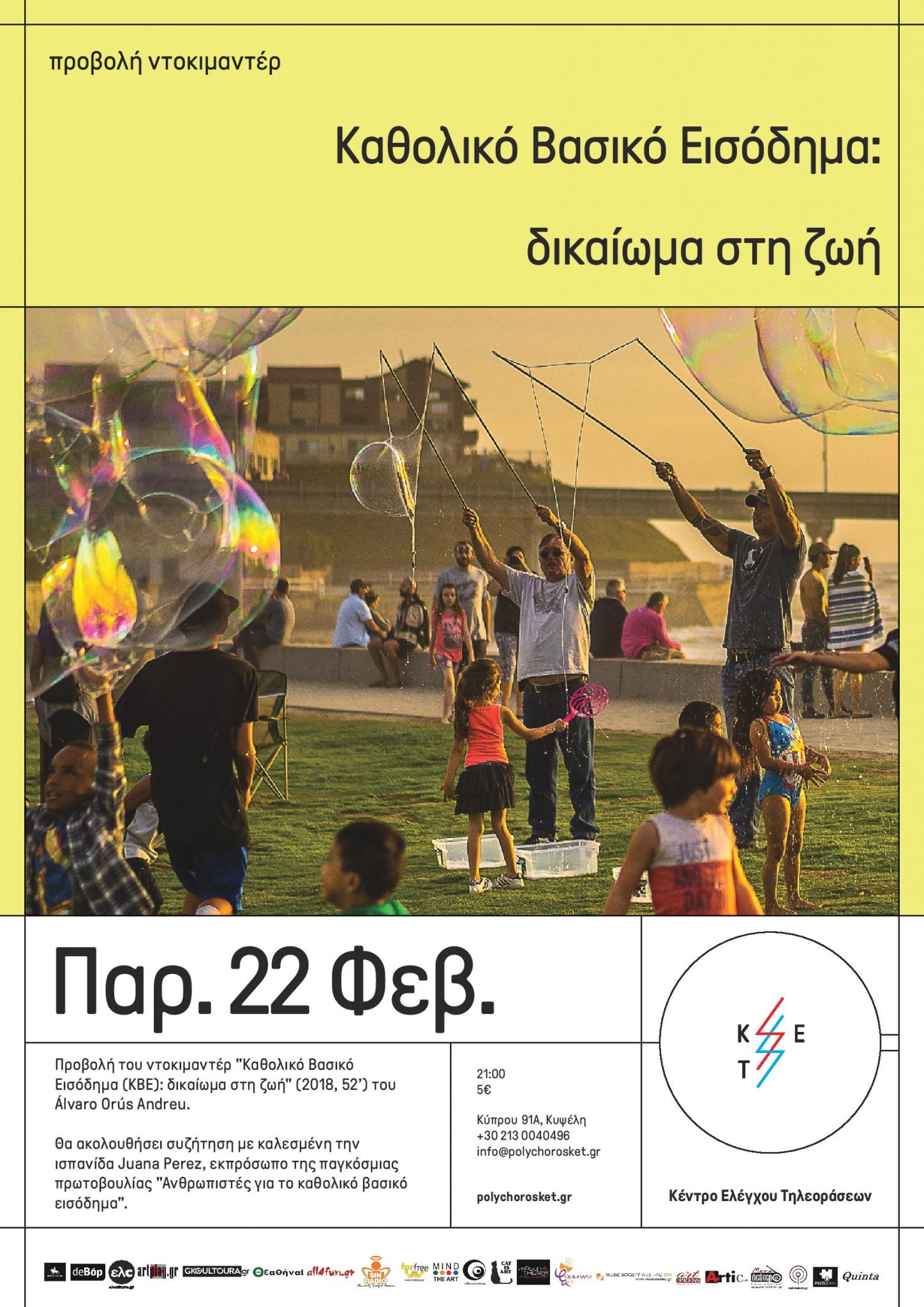 Το ντοκιμαντέρ “Καθολικό Βασικό Εισόδημα (ΚΒΕ): δικαίωμα στη ζωή” (2018, 52’), ασχολείται με το δικαίωμα όλων των ανθρώπων να μπορούν να διαβιώνουν, δικαίωμα που προκύπτει και μόνο από το γεγονός ότι έχουν γεννηθεί. Πρόκειται για μια ιδέα που έχει ήδη πίσω της ιστορία, αλλά και που έχει προωθηθεί με εξαιρετικούς ρυθμούς τα τελευταία χρόνια, κυρίως εξαιτίας του γεγονότος ότι η τεχνολογική πρόοδος απειλεί να αφήσει την πλειονότητα των ανθρώπων χωρίς εργασία και κατά συνέπεια χωρίς τη δυνατότητα να μπορούν να καλύπτουν τις βασικές τους ανάγκες. Το ντοκιμαντέρ περιλαμβάνει συνεντεύξεις από ακαδημαϊκούς, ακτιβιστές και ακτιβίστριες, που εξηγούν την εμπειρία τους, όπως αυτή προκύπτει από την απασχόλησή τους με το θέμα τα τελευταία τριάντα χρόνια ανά τον κόσμο.
