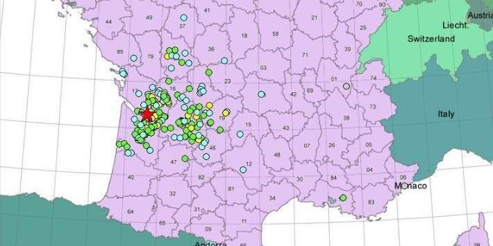 Στις 11:07 πμ, η εφημερίδα δημοσίευσε στο εξώφυλλο της ηλεκτρονικής της έκδοσης, ένα άρθρο με τίτλο: ”Εγκέλαδος μεγέθους 4,9 βαθμών στην Sud-Ouest”. Αυτό το άρθρο, ενημερώθηκε εκ νέου στις 3μμ. Υπήρχε ένας χάρτης (ακολουθεί) και από κάτω έγραφε τα εξής: