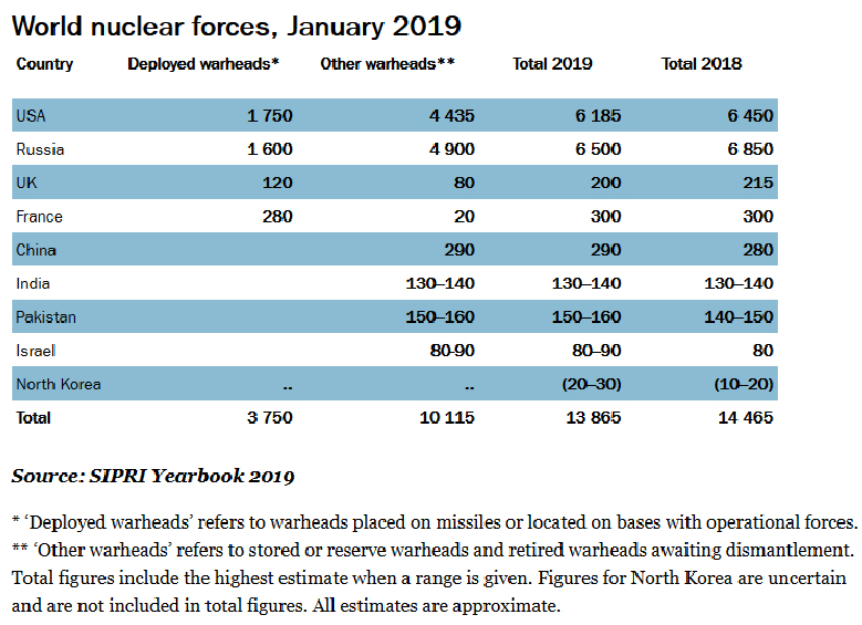 Στις αρχές του 2019, εννέα κράτη – οι Ηνωμένες Πολιτείες, η Ρωσία, το Ηνωμένο Βασίλειο, η Γαλλία, η Κίνα, η Ινδία, το Πακιστάν, το Ισραήλ και η Λαϊκή Δημοκρατία της Κορέας (Βόρεια Κορέα) – διέθεταν περίπου 13.865 πυρηνικά όπλα. Σημείωσαν μείωση από τα 14.465 περίπου πυρηνικά όπλα που εκτιμά το SIPRI ότι διέθεταν στις αρχές του 2018 (βλ. πίνακα).