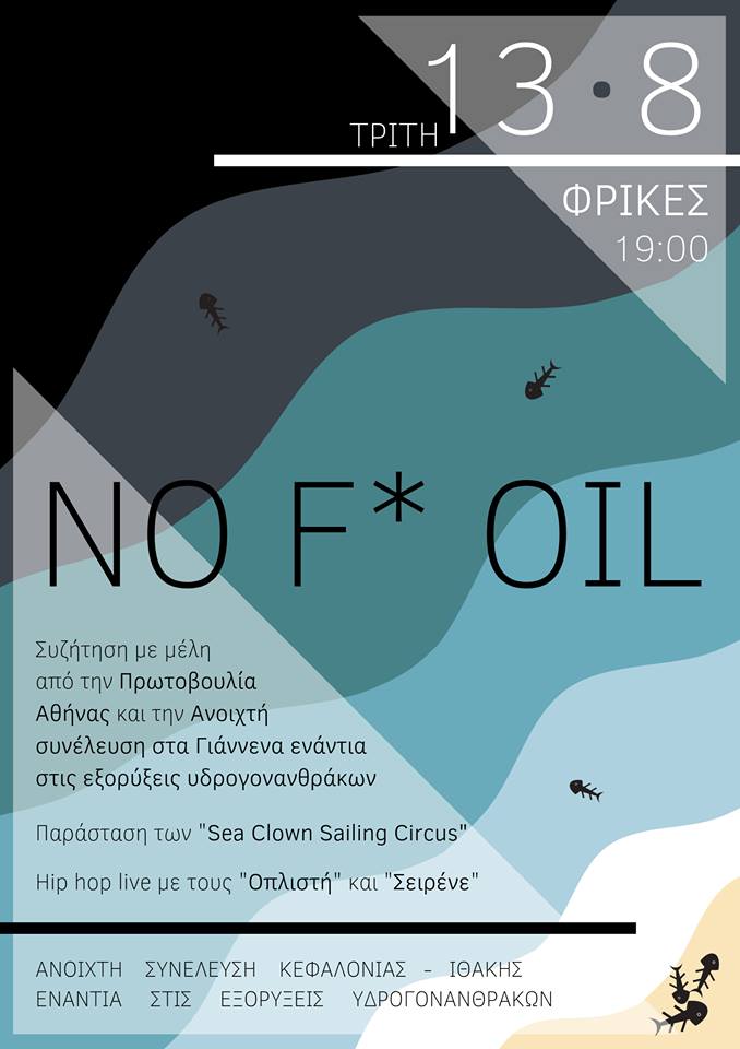 Η Ανοιχτή Συνέλευση Κεφαλονιάς και Ιθάκης ενάντια στις εξορύξεις υδρογονανθράκων καλεί άτομα και συλλογικότητες στο νησί της Ιθάκης, στην περιοχή Φρίκες, στις 13 Αυγούστου 2019, από τις 19.00 και μέχρι το βράδυ.