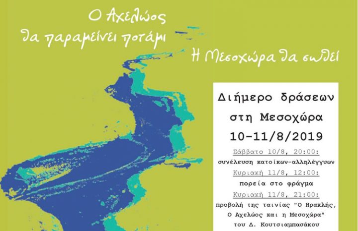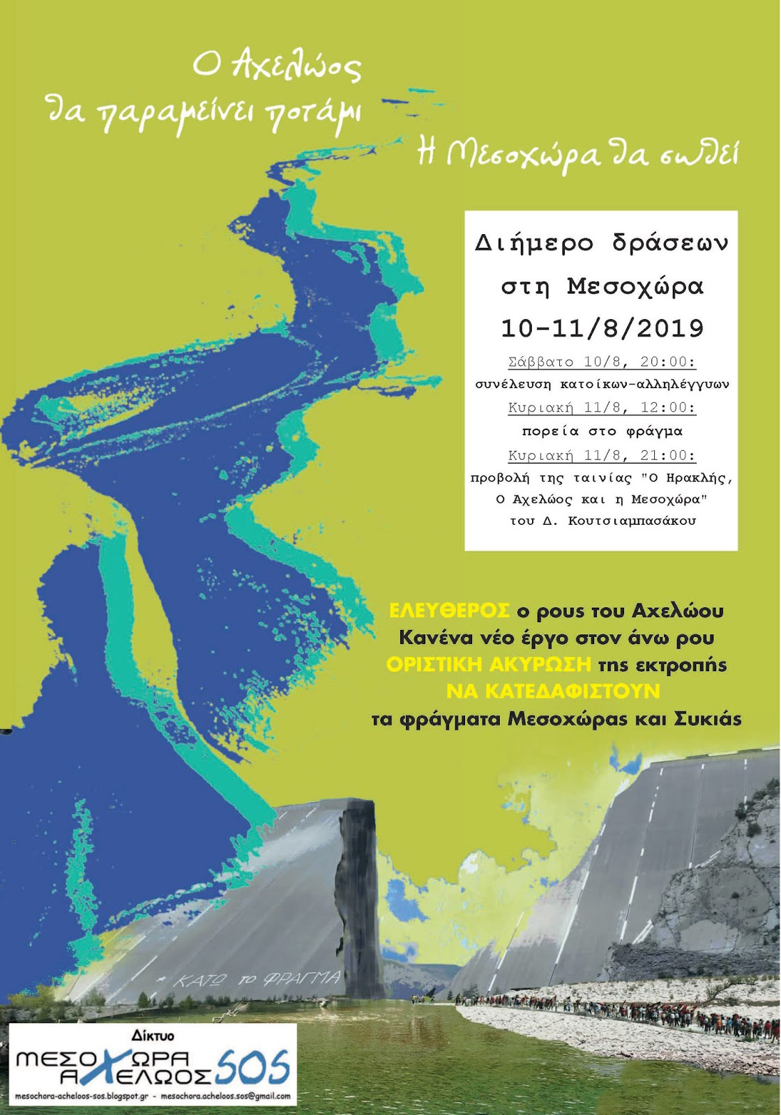 Μέσα σε ένα νέο πολιτικό περιβάλλον, που δεν προμηνύει τίποτα καλό για τη Μεσοχώρα, ξαναβρισκόμαστε στη καλοκαιρινή μας συνάντηση στη Μεσοχώρα και στις όχθες του Αχελώου. Σε διήμερο δράσεων καλεί το Δίκτυο «Μεσοχώρα – Αχελώος SOS», το Σαββατοκύριακο 10-11 Αυγούστου 2019, που περιλαμβάνει: