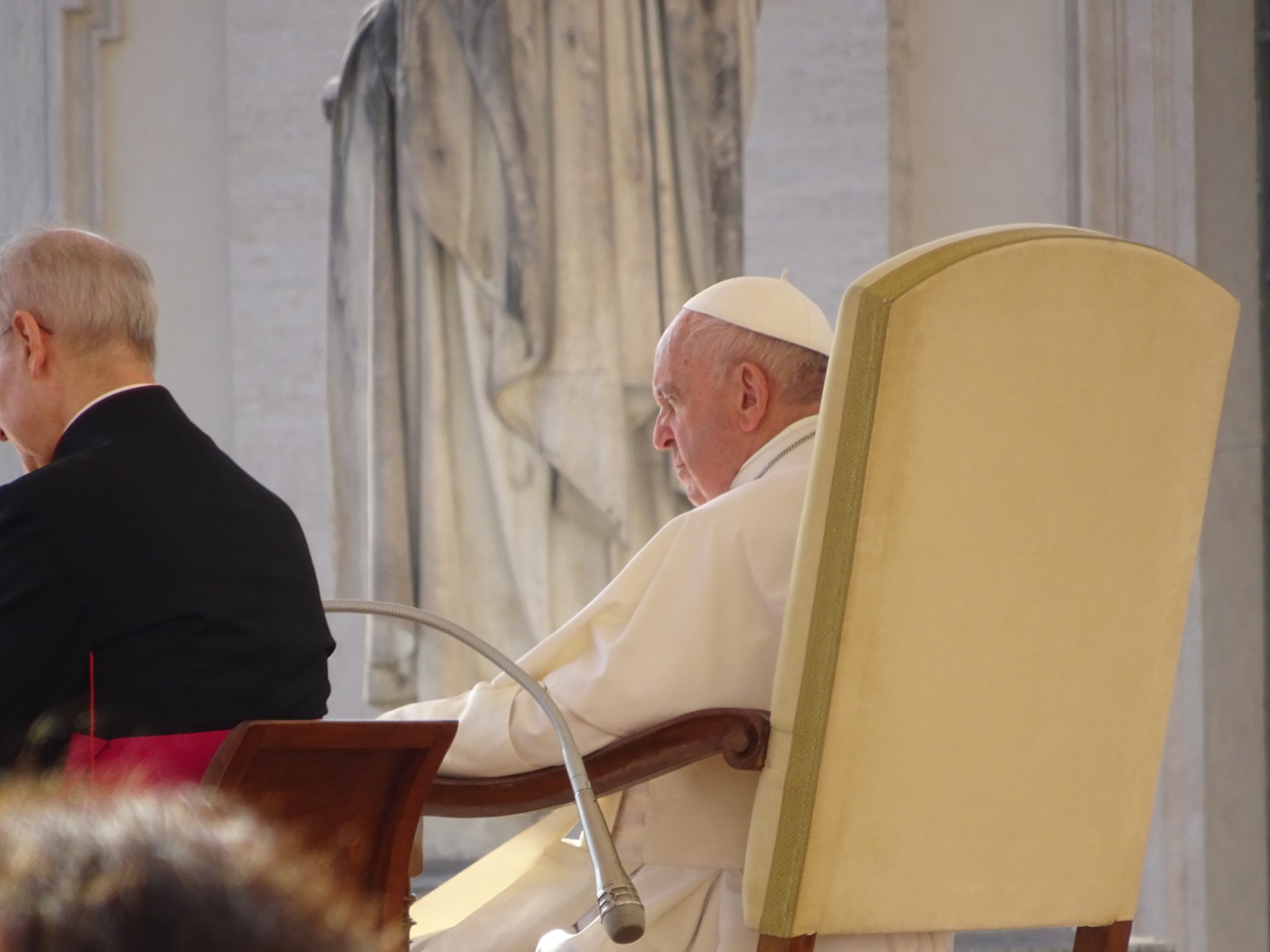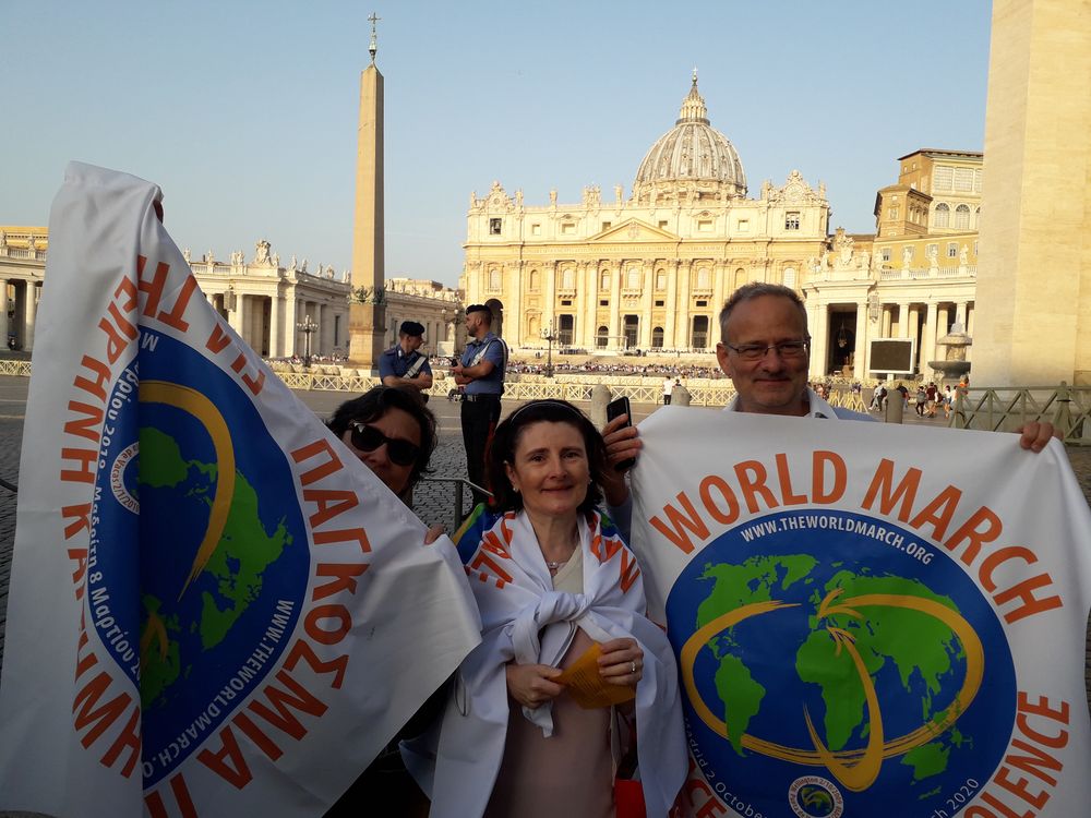 Ώρα 9 το πρωί έξω από το Βατικανό. Η αντιπροσωπεία της 2ης Παγκόσμιας Πορείας για την Ειρήνη και τη Μηβία, με επικεφαλής τον ιδρυτή της, Rafael de la Rubia, κατευθύνεται προς τον έλεγχο της εισόδου, για να παρακολουθήσει την Γενική Ακρόαση του Πάπα Φραγκίσκο. Έχει καταφτάσει πολύς κόσμος από διαφορετικές χώρες και ομάδες γι αυτή την “επαφή” με τον Πάπα. Ο Rafael de la Rubia βρίσκεται στην πρώτη σειρά και έτσι έχει την ευκαιρία να ενημερώσει τον Πάπα γι αυτή τη δεύτερη απόπειρα που γίνεται να γυρίσουν τον πλανήτη, φέρνοντας το μήνυμα της ειρήνης και της μηβίας σε τόπους που υπάρχουν συγκρούσεις. Εξωτερικές συγκρούσεις, όπως πόλεμοι ή κυβερνήσεις που εφαρμόζουν βίαιες πολιτικές. Εσωτερικές επίσης, εκεί που η εσωτερική μας ενότητα υποφέρει από ρήγματα, καθώς έχει υποστεί και αναπαράξει βία.