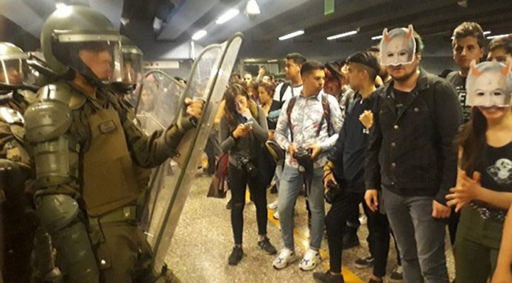 Αυτή την εβδομάδα έγινε ένα μαζικό κάλεσμα για να περνάει ο κόσμος πάνω από τις μπάρες στο μετρό του Σαντιάγκο, ως απάντηση στην τέταρτη αύξηση των εισιτηρίων για φέτος. Κυρίως μαθητές λυκείου μπήκαν μαζικά στους σταθμούς, χωρίς οι φρουροί ασφαλείας να μπορούν να τους αντιμετωπίσουν. Μετά από λίγο άρχισαν να κλείνουν ορισμένοι σταθμοί και μπήκαν οι ειδικές δυνάμεις της Αστυνομία, απωθώντας με δακρυγόνα, γκλομπ ακόμη και σκύλους. Σήμερα έγινε επίσης καταστολή με σκάγια, πράγμα που άφησε πολλούς μαθητές τραυματισμένους.